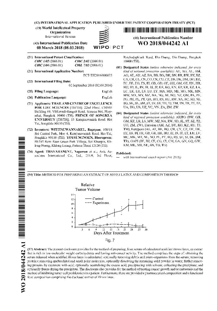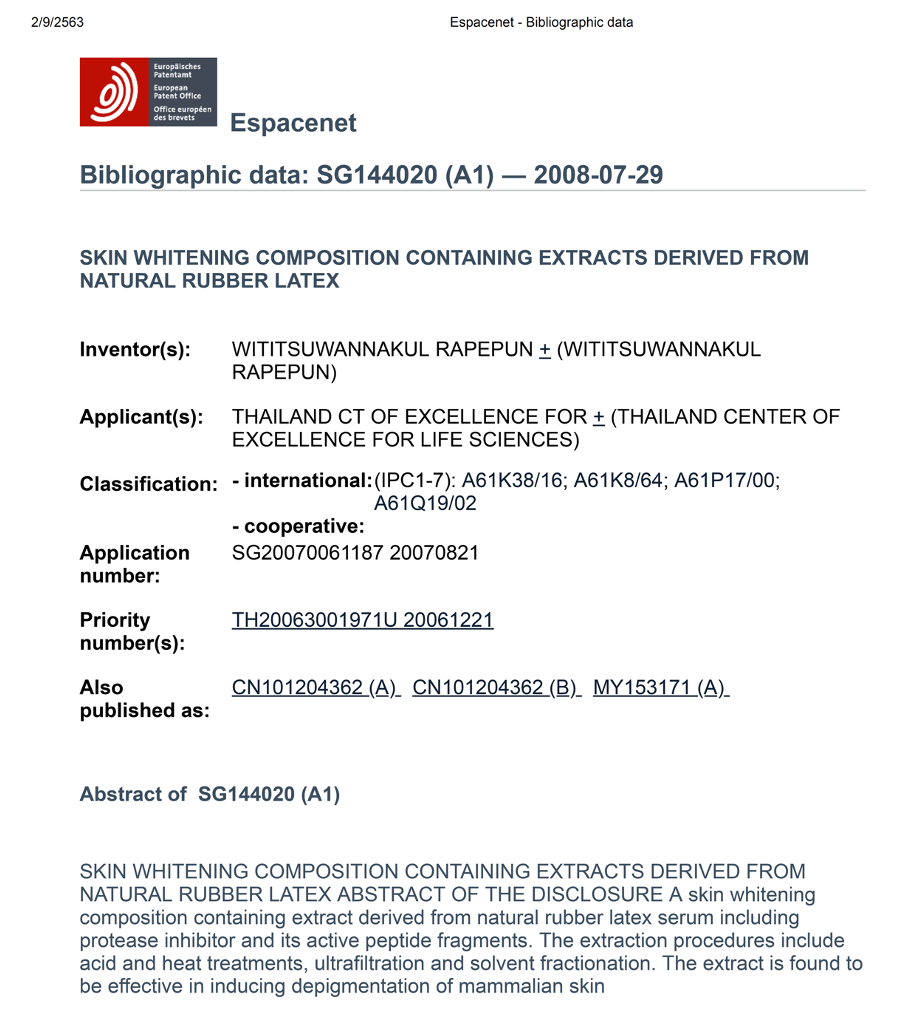 - Wititsuwannakul, R.(Inventor) “Skin whitening biochemicals extracted from natural rubber latex serum” Thai Petty Patent No. 4907(2009).